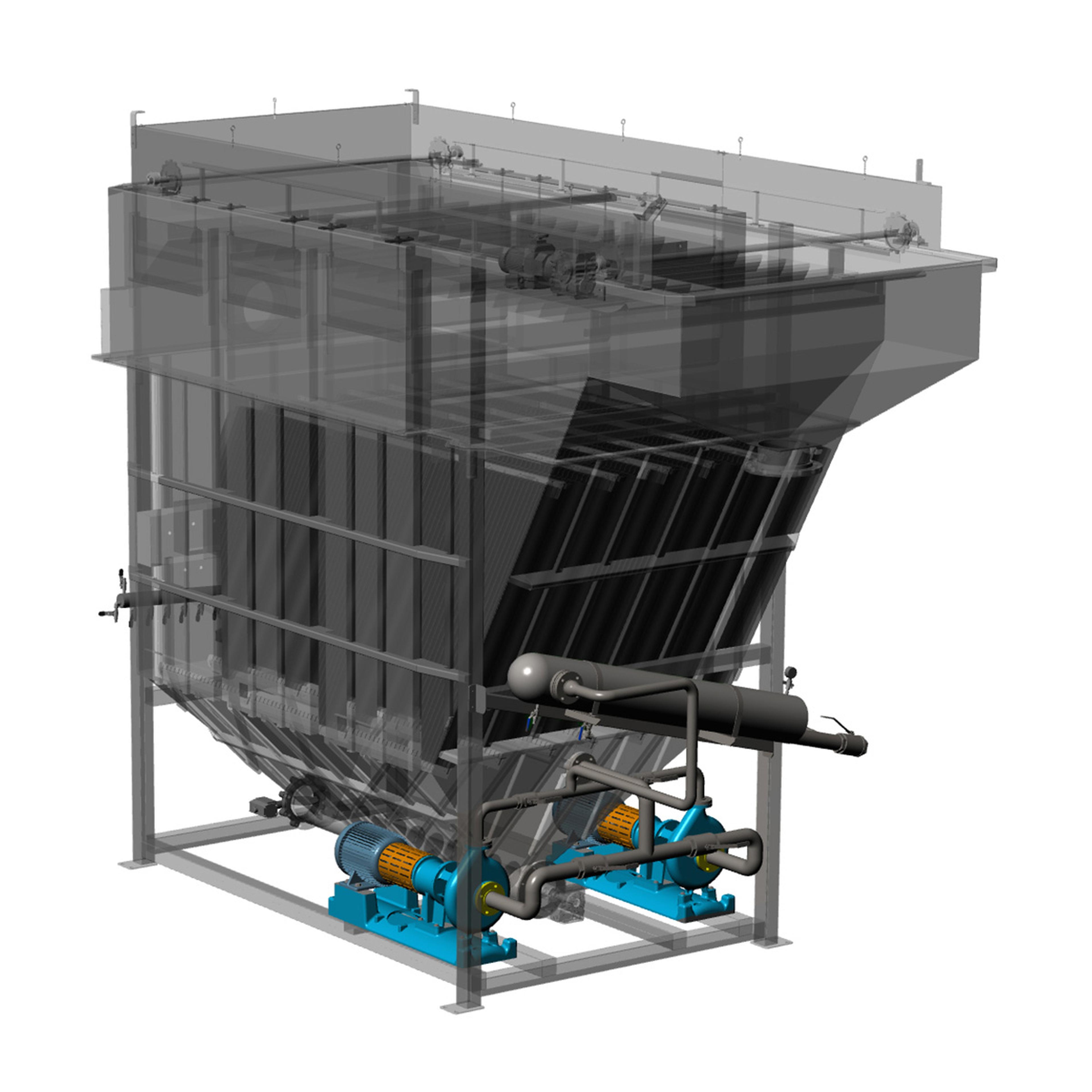 A cross‑flow plate pack increases the effective separation area inside the tank. This supports stable separation performance at higher loading rates without increasing the tank size.